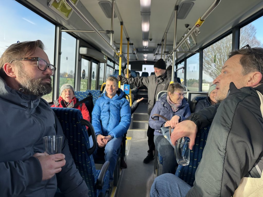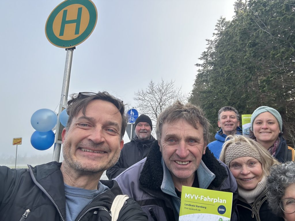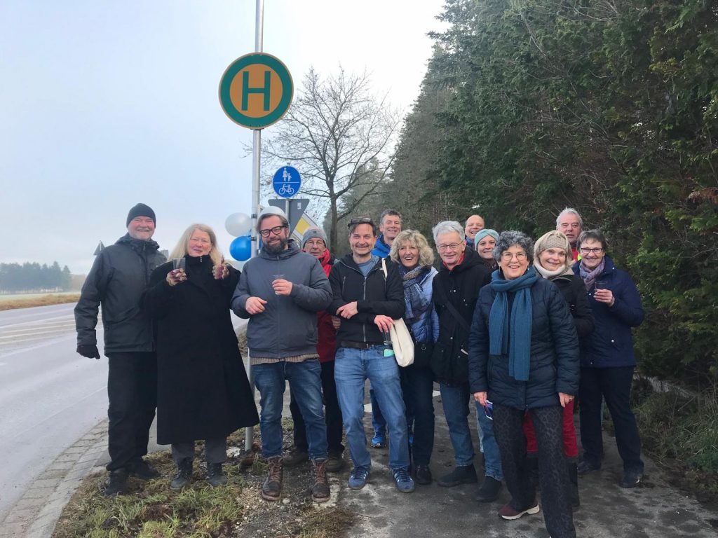 Mit dabei waren auch die Bürgermeisterkandidaten Stefan Berchtold (Unterbrunn) und Matthias Ilg (Königswiesen), der Sebastian Fuchsberger vom ADFC, Hans Herde vom Seniorenbeirat und einige Unterbrunnerinnen und Unterbrunner, die sich ganz besonders auf den Halt gefreut hatten. Die Kathrin zum Beispiel, die ihren Sohn jetzt nicht mehr in der Früh zum Expressbushalt am Pennykreisel fahren muss, und der Stefan, der den Bus als erster bereits am Sonntag getestet hatte.